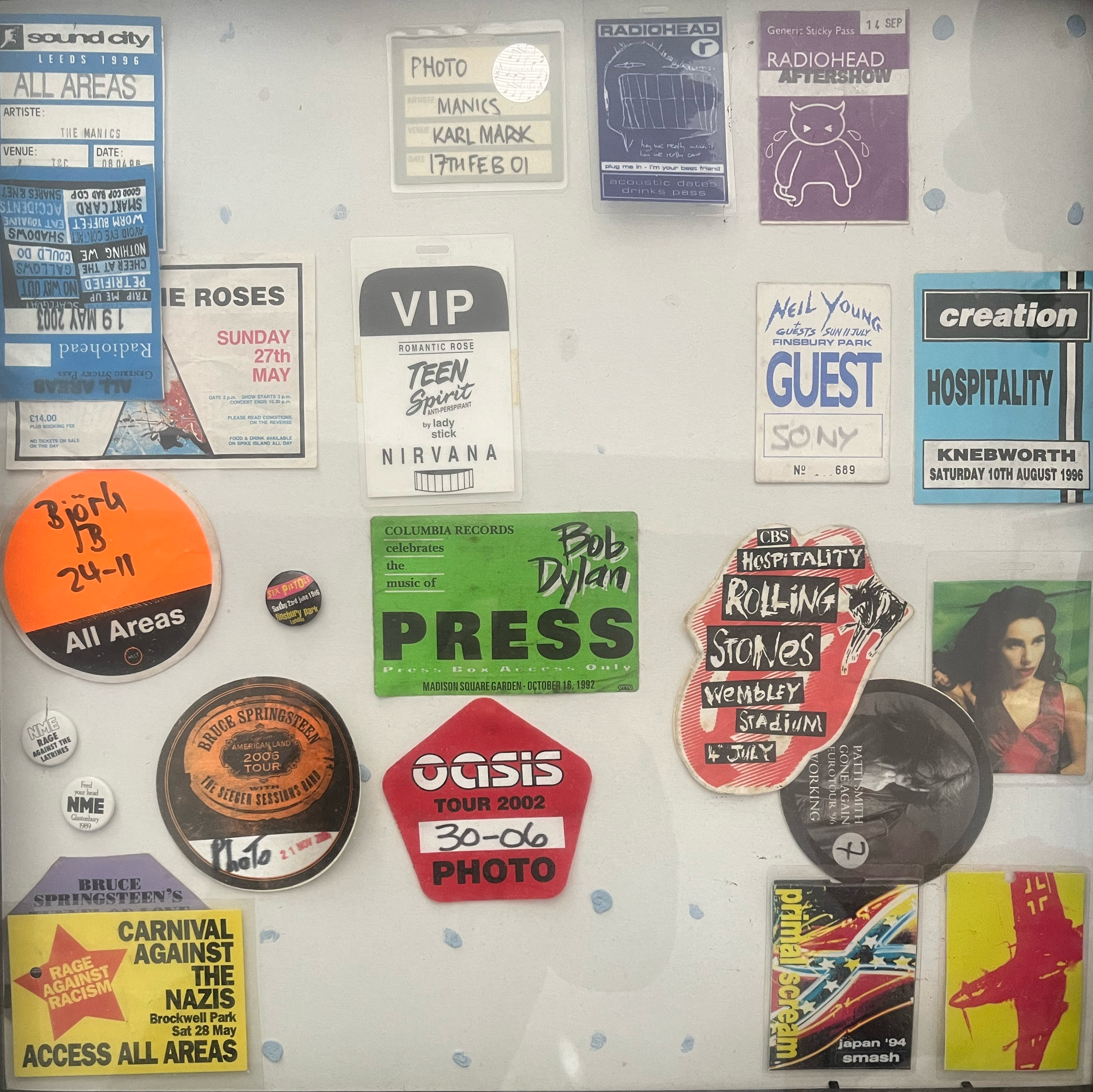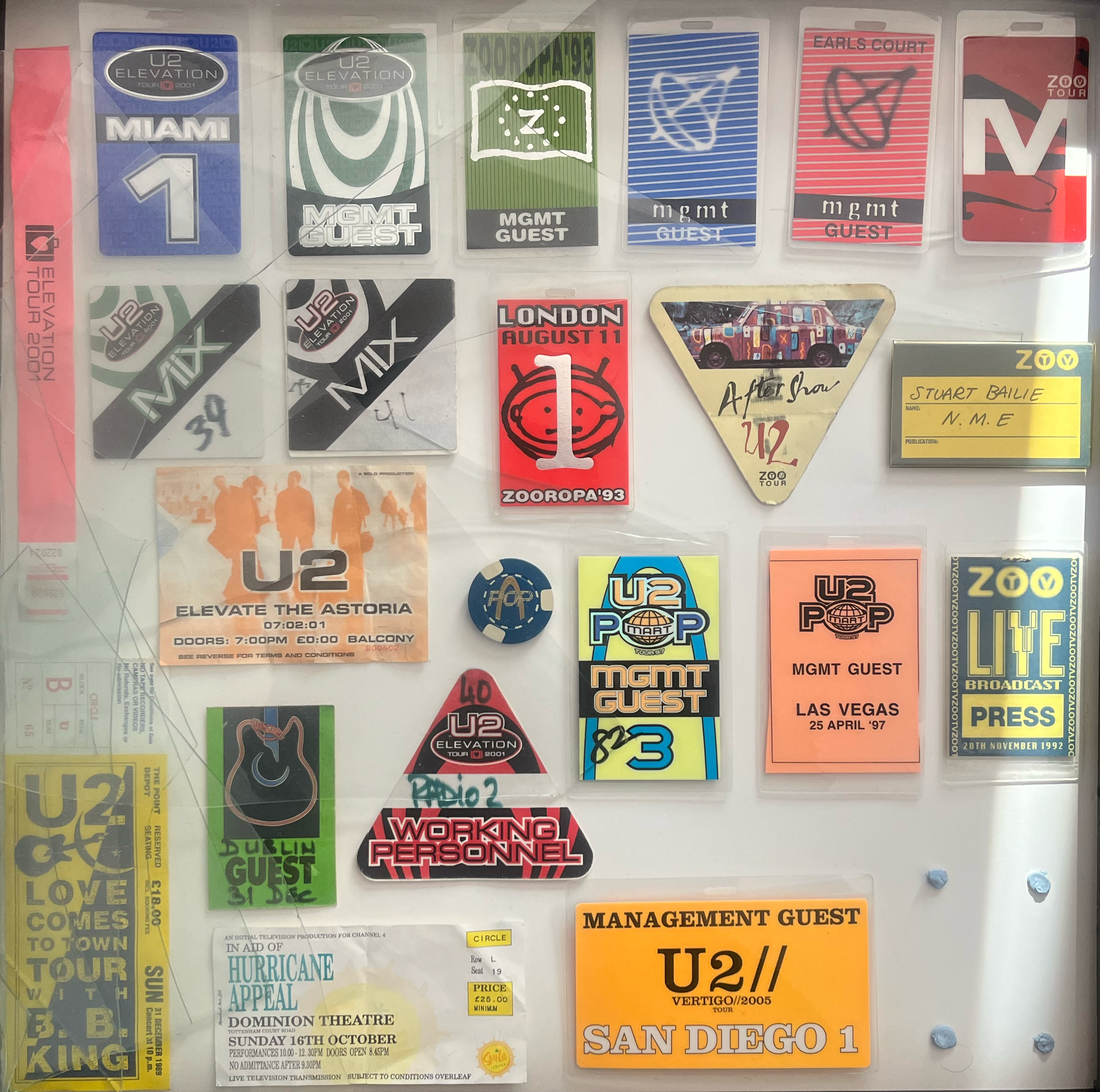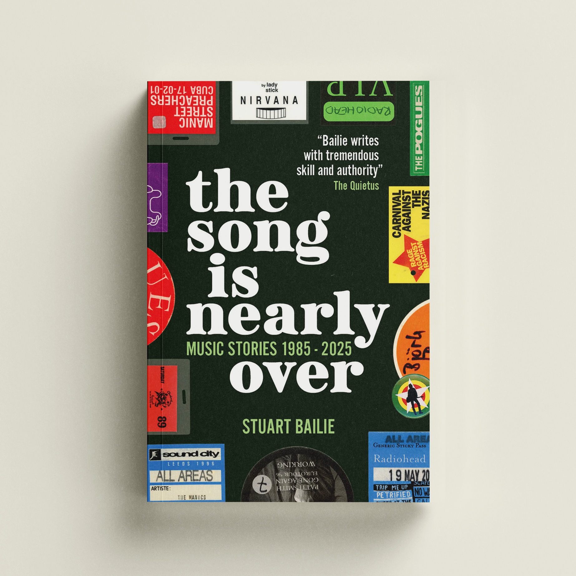 I was commissioned to design the cover in 2025. I knew this book needed to be special and eye-catching. I wanted to convey the exclusivity and excitement of the stories inside. After seeing his archive of colourful and unique concert press passes, I knew they would be perfect for the cover. There are these colours and logos that we immediately associate with the artists that they belong to. It also conveys the sheer amount of time and commitment in these artists’ worlds that Stuart experienced.