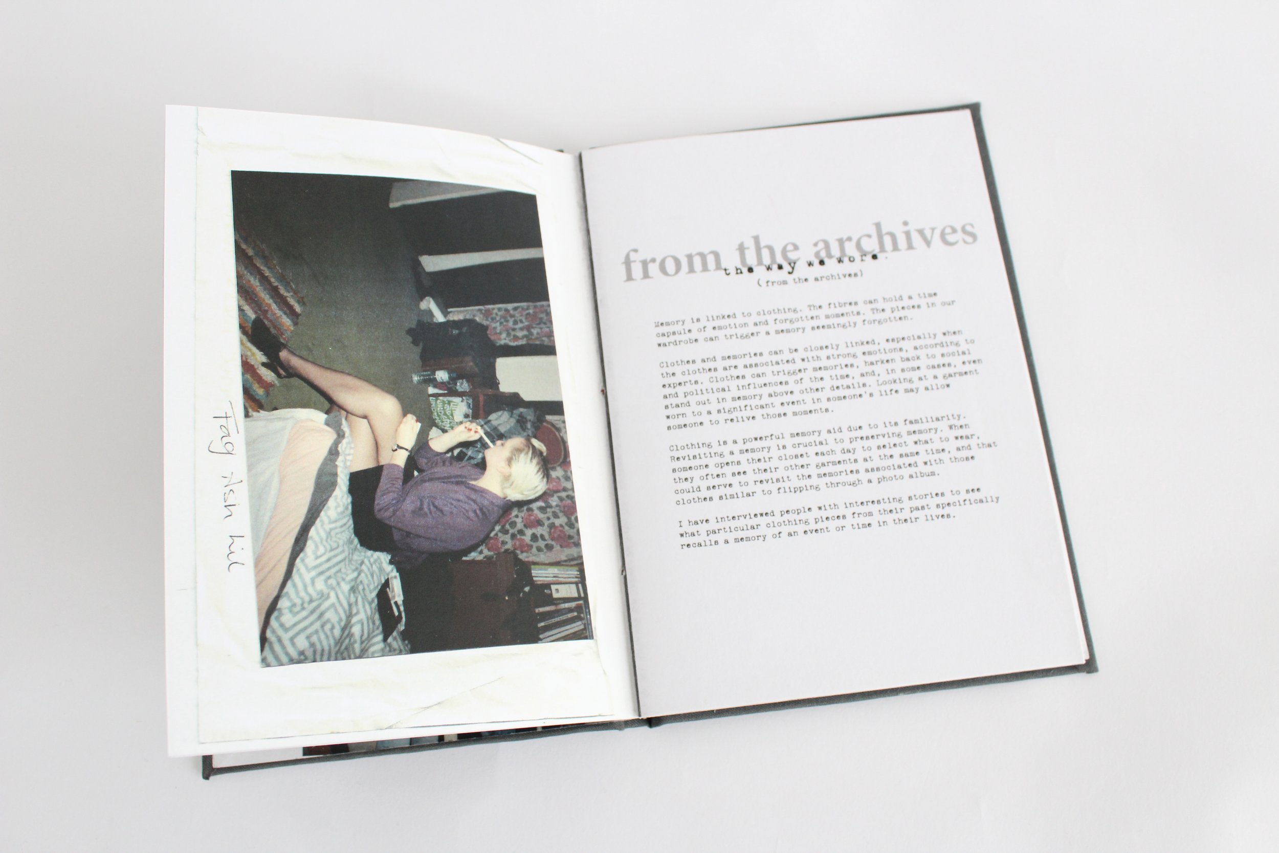 The Way We Wore is a personal project I created around how memory is linked to clothing. I interviewed people about the memories they have associated with their clothing. The book is made and bound by hand.